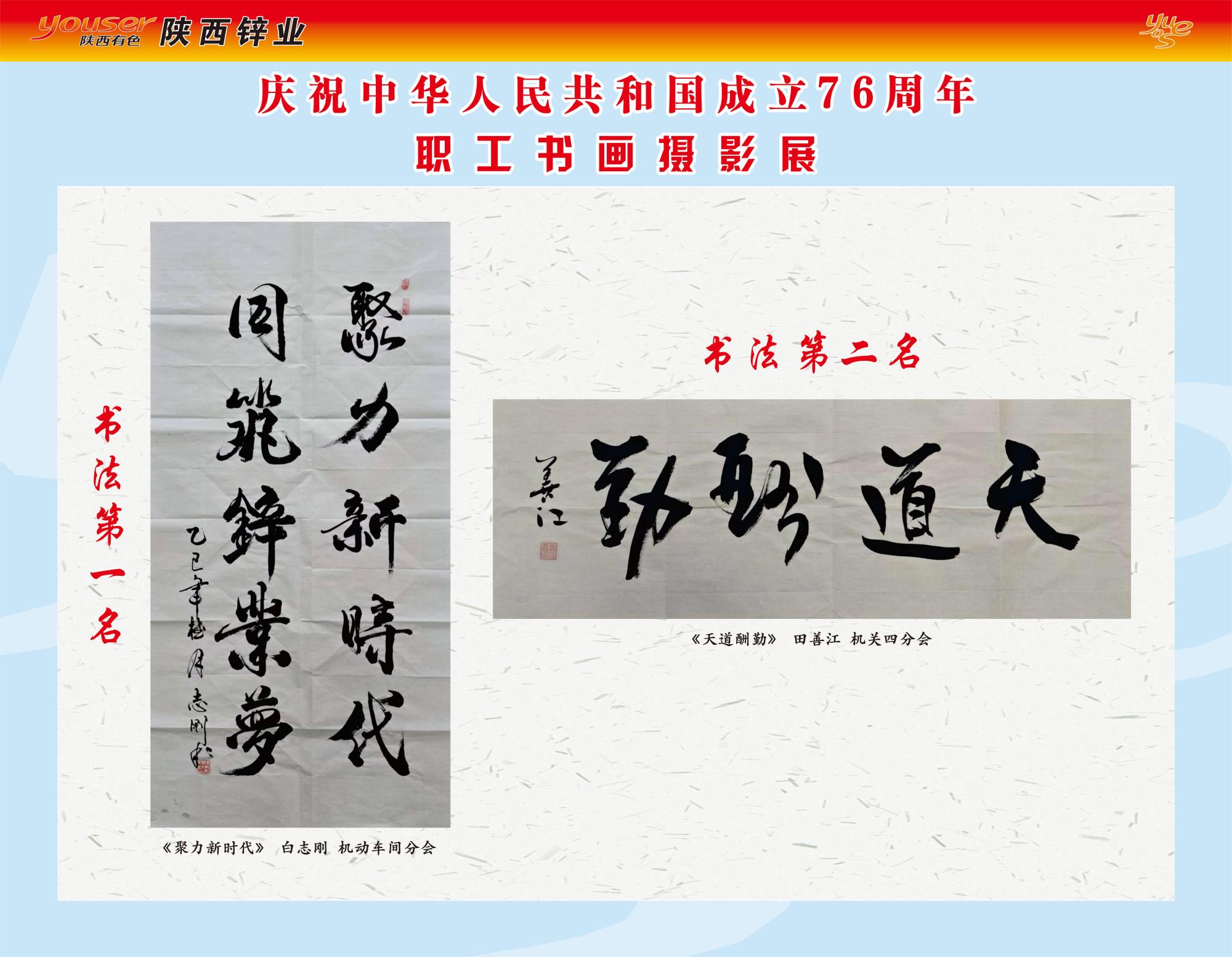 書法類:一等獎機動車間分會《聚力新時代》;二等獎機關(guān)四分會《天道酬勤》;三等獎鋅粉車間分會《勞動最光榮》。