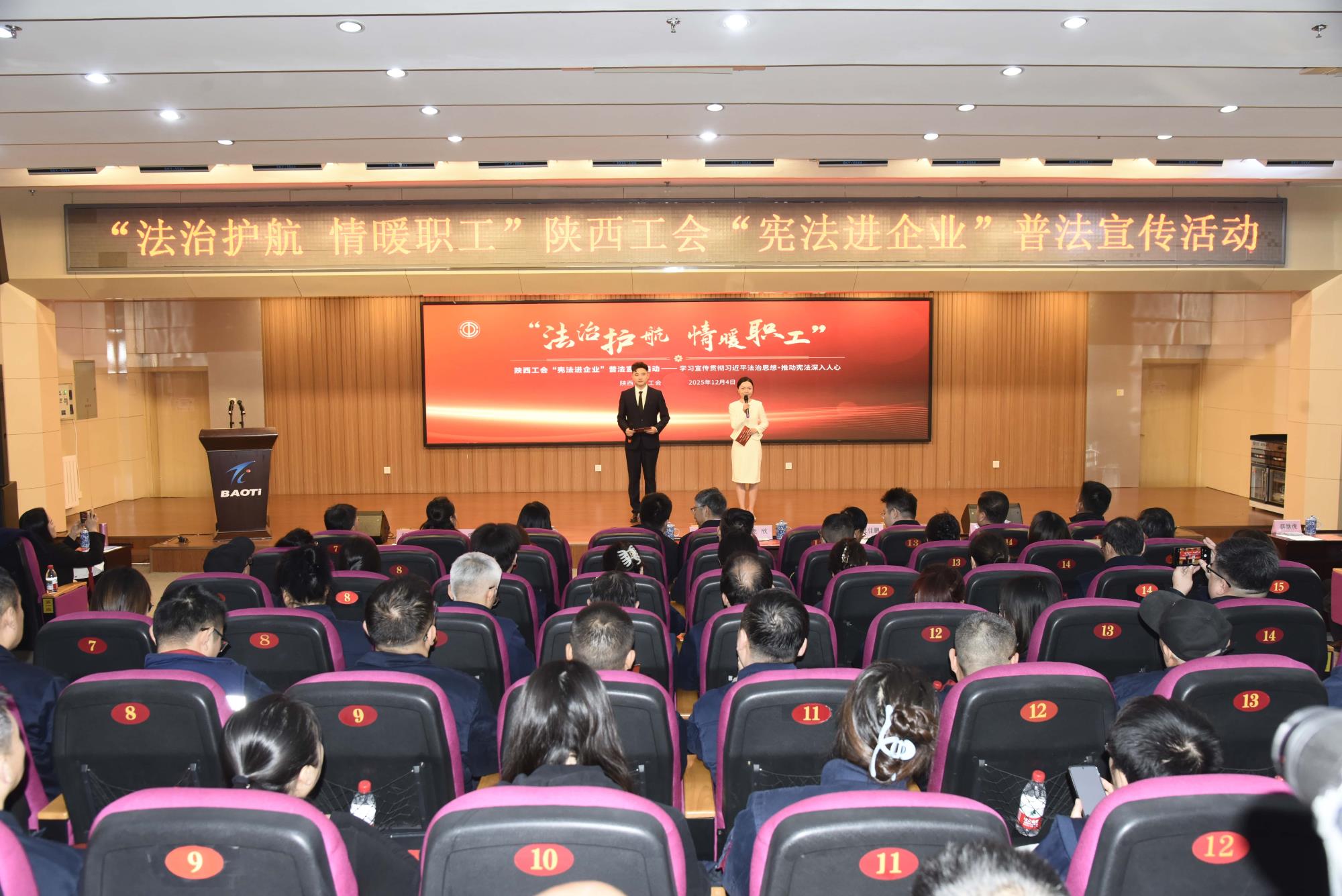 12月4日,第十二個國家憲法日當天,由陜西省總工會主辦,省機械冶金建材工會、寶雞市總工會協(xié)辦的“法治護航·情暖職工”陜西工會“憲法進企業(yè)”普法宣傳活動在寶鈦集團寶鈦賓館七樓學術報告廳舉行。