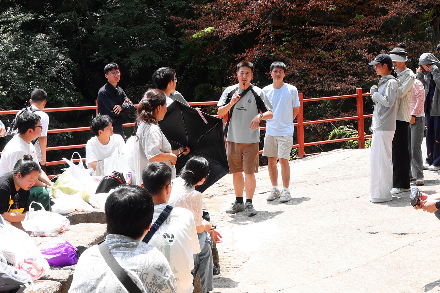 抵達(dá)目的地后,全員進(jìn)行了熱身,為登山做好充分準(zhǔn)備。隨后自由組合成4個(gè)小組,推選組長并統(tǒng)籌協(xié)調(diào)。徒步途中,一幕幕暖心場景接連上演:體力充沛的青年主動(dòng)接過同伴的背包,陡峭路段上隊(duì)員們手手相扣形成穩(wěn)固“人鏈”,有人步伐放緩時(shí),身旁立刻響起“加油,我們一起走”的鼓勁聲,更有不少人沿途彎腰撿拾垃圾,以行動(dòng)踐行“無痕戶外”理念……這些雙向奔赴的扶持,讓攀登之路充滿溫度,更生動(dòng)詮釋了“共攀高峰”絕非單打獨(dú)斗,而是并肩前行的深層含義。最終,在全員互助下,所有成員成功登頂,無人掉隊(duì)。山頂?shù)膱F(tuán)建游戲?qū)夥胀葡蚋叱保骸敖叹氄f”游戲中,大家全神貫注捕捉指令,在動(dòng)靜之間錘煉反應(yīng)與專注;“運(yùn)動(dòng)大腦”環(huán)節(jié)里,拋接水瓶的互動(dòng)讓團(tuán)隊(duì)配合愈發(fā)流暢,笑聲與喝彩聲在山間回蕩。