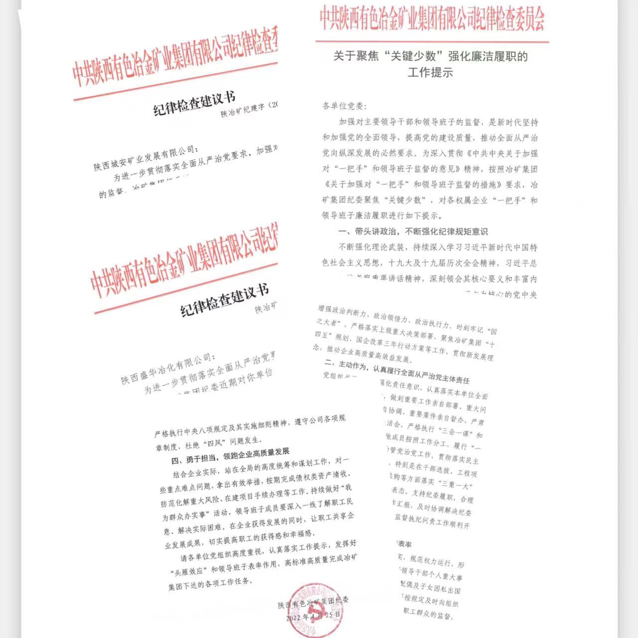 2022年是陜西有色金屬集團(tuán)“高質(zhì)量項目建設(shè)年”,冶礦集團(tuán)及各權(quán)屬單位共涉及6個建設(shè)項目,其中實施類項目3個,儲備類項目2個,研發(fā)類項目1個。為確保項目建設(shè)取得實效,冶礦集團(tuán)紀(jì)委靠前監(jiān)督,聚焦主責(zé)主業(yè),下發(fā)了《關(guān)于聚焦“關(guān)鍵少數(shù)” 強化廉潔履職的工作提示》,督促各權(quán)屬單位“一把手”及領(lǐng)導(dǎo)班子遵紀(jì)守法、嚴(yán)于律己,筑起項目建設(shè)廉潔“防火墻”。